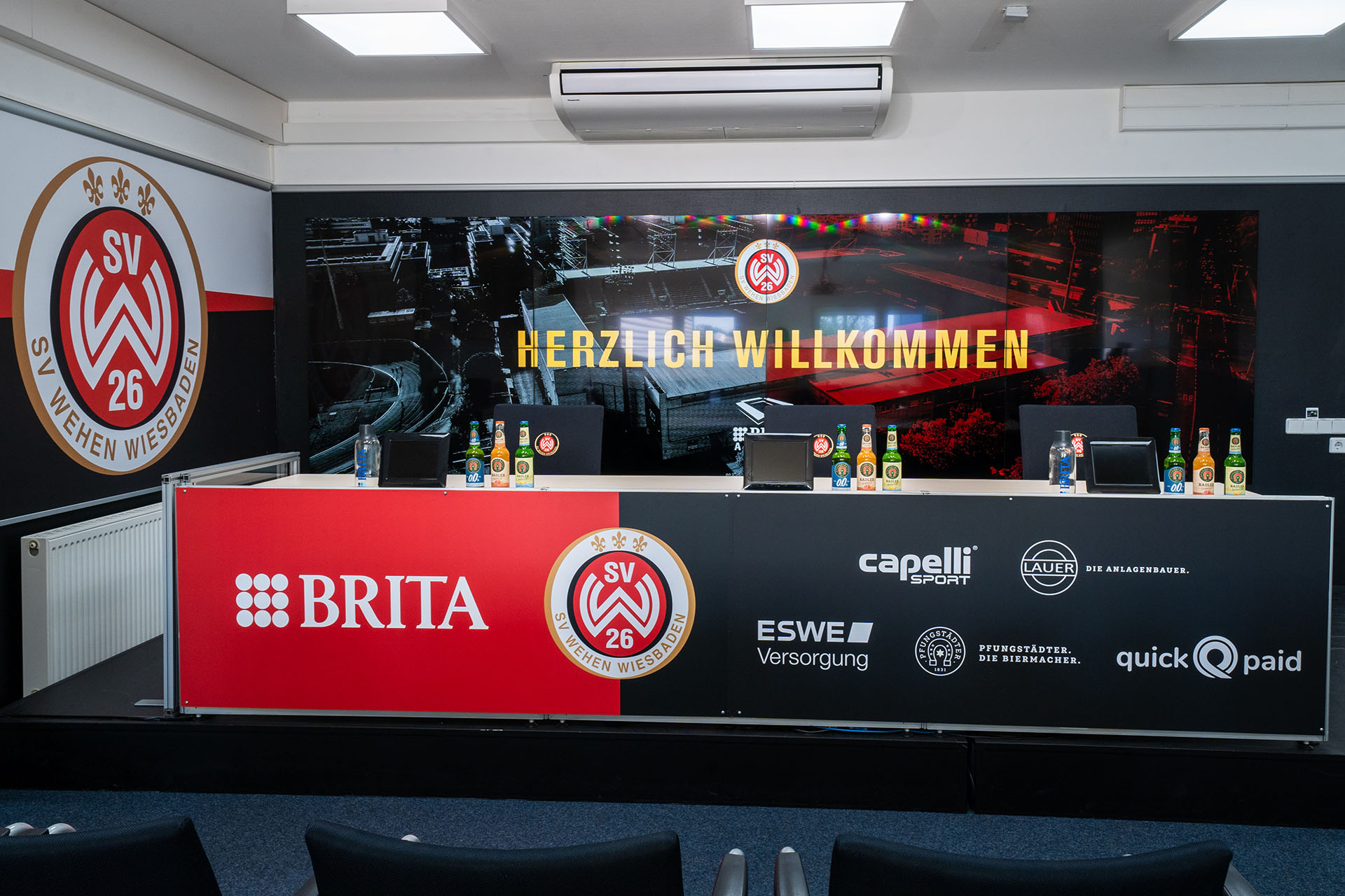 AusstattungPodium inkl. digitaler Rückwand, großer Konferenztisch